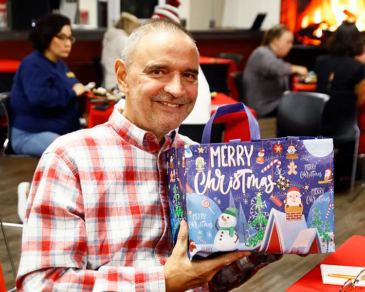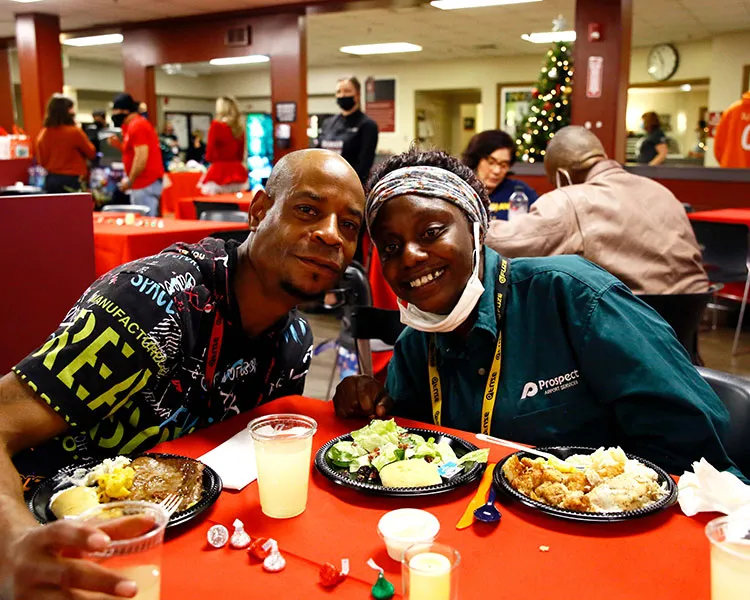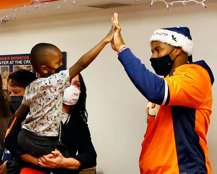The 2021 Broncos Holiday Party was back in full swing this year! Broncos players came to The Crossing and served a delicious meal of roast beef, stuffed chicken, vegetables, mashed potatoes, salad, and pecan pie. Miles the Mascot and Broncos cheerleaders helped spread Christmas cheer as individuals and families in our STAR Transitional Program came in to eat and receive a gift bag filled with hot chocolate, marshmallows, beef jerky, and a board game or blanket.
