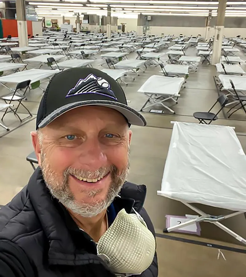Known in the Christian faith as Maundy Thursday when Jesus had his last supper—his last meal—with his disciples. A special time in our history. After weeks of working with the City of Denver’s emergency team and other nonprofit shelter providers on daily zoom calls seeking alternatives and solutions, we were able to secure the National Western Complex for a 765 bed shelter for men, operating 24/7! That is why I am smiling in this photo!