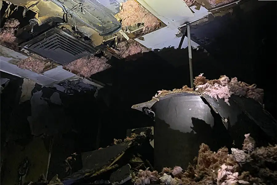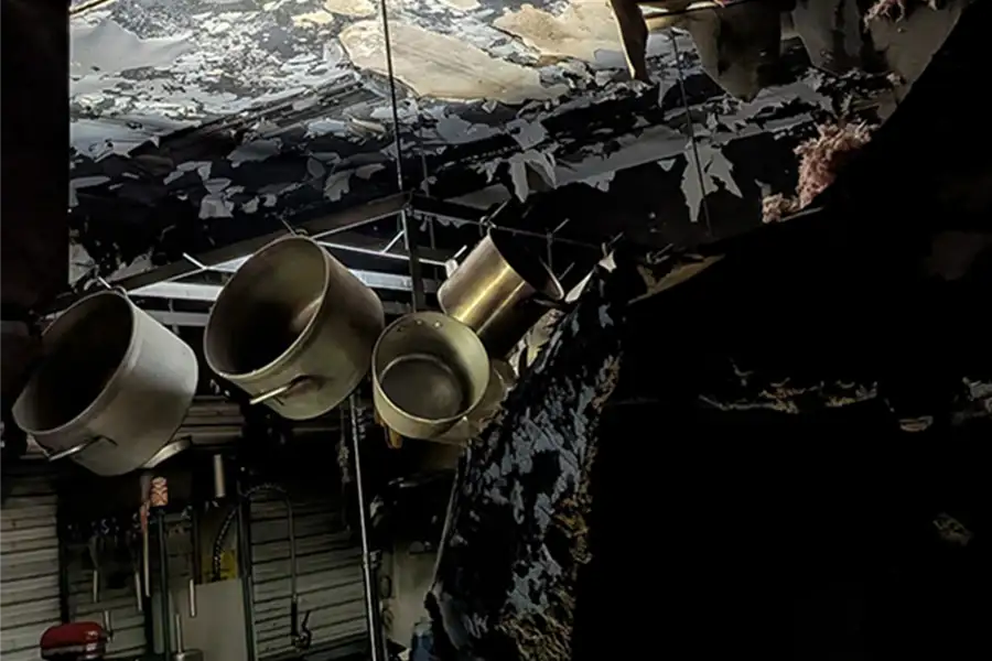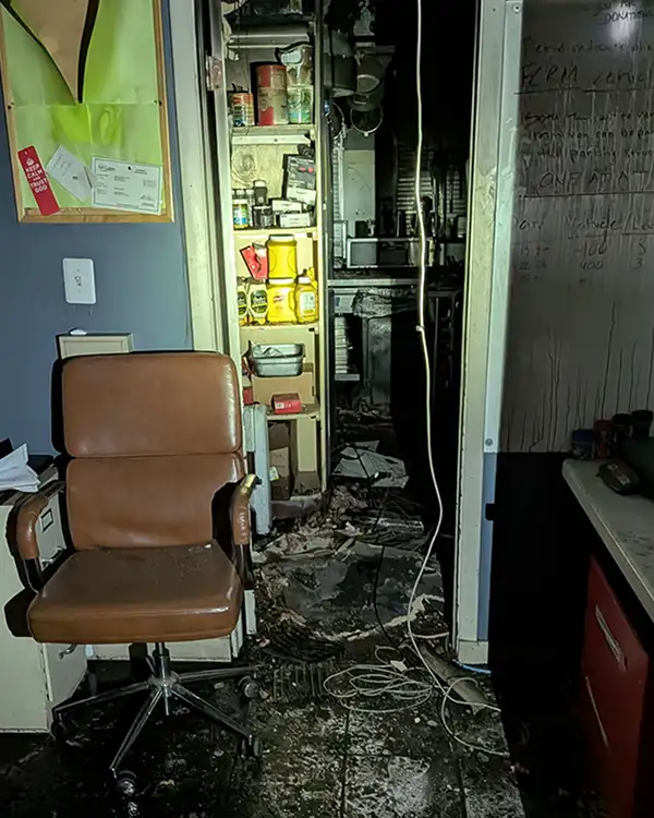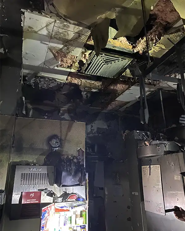 The damage is extensive. The kitchen’s roof was engulfed in flames, and its walls are blackened with soot. Much of the ceiling was destroyed, leaving insulation and ductwork exposed. The floors are covered in ash and there’s exposed wiring. The fire also damaged the adjacent office space. Electric and gas were quickly shut off to prevent any further damage per safety protocols. The entire building has been impacted by smoke damage.