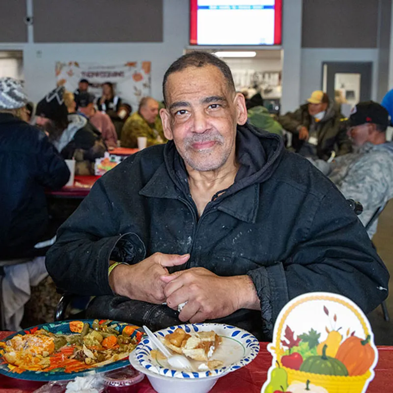 “The Thanksgiving meal means more than most people think. It means my smile will always prosper, I’ll always have good friends and that there are people out there that are caring for us no matter where we stand. Amen. God bless. I’m glad to know that I have the opportunity to get to meet the volunteers and the meal has brought us all together. Everybody is getting along, and they got big smiles.”