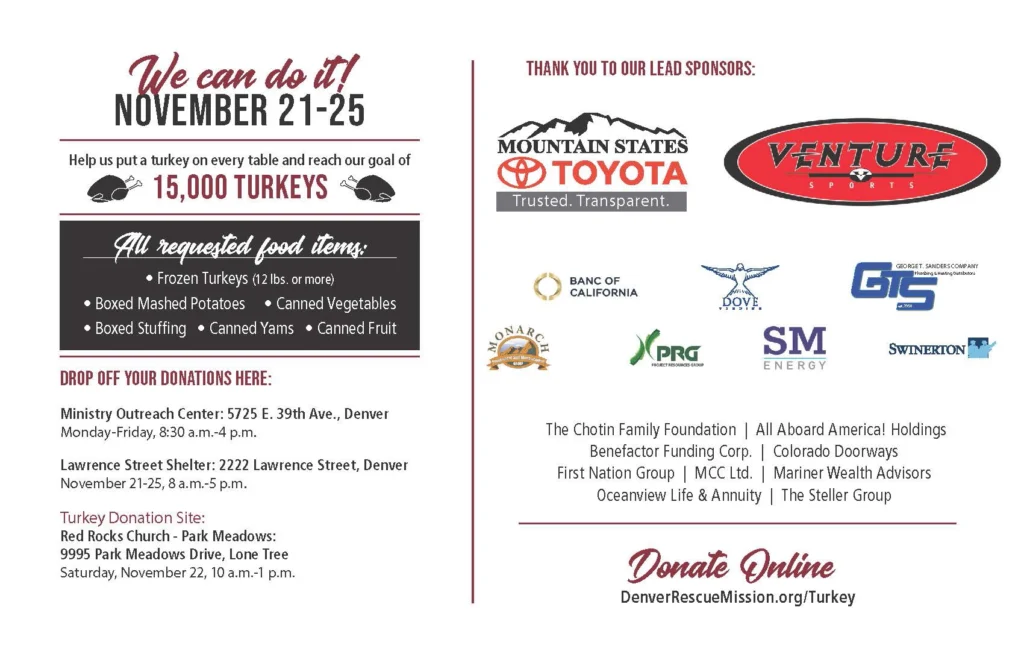 It’s turkey time! Join us for our annual Turkey Drive and help us put a turkey on every table, providing a hearty Thanksgiving meal for thousands of Colorado families and individuals in need, and providing critically needed meals throughout the holiday season.